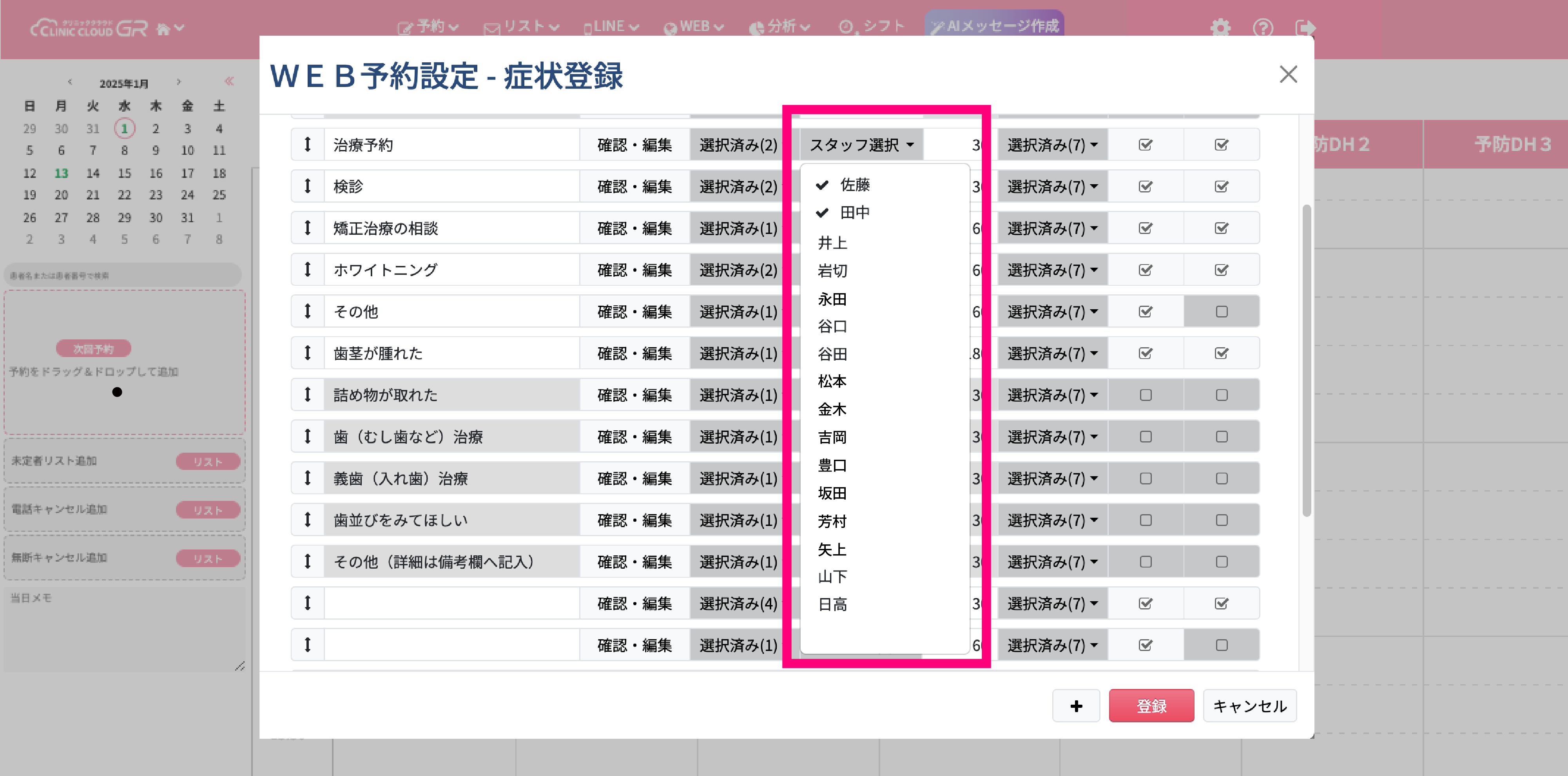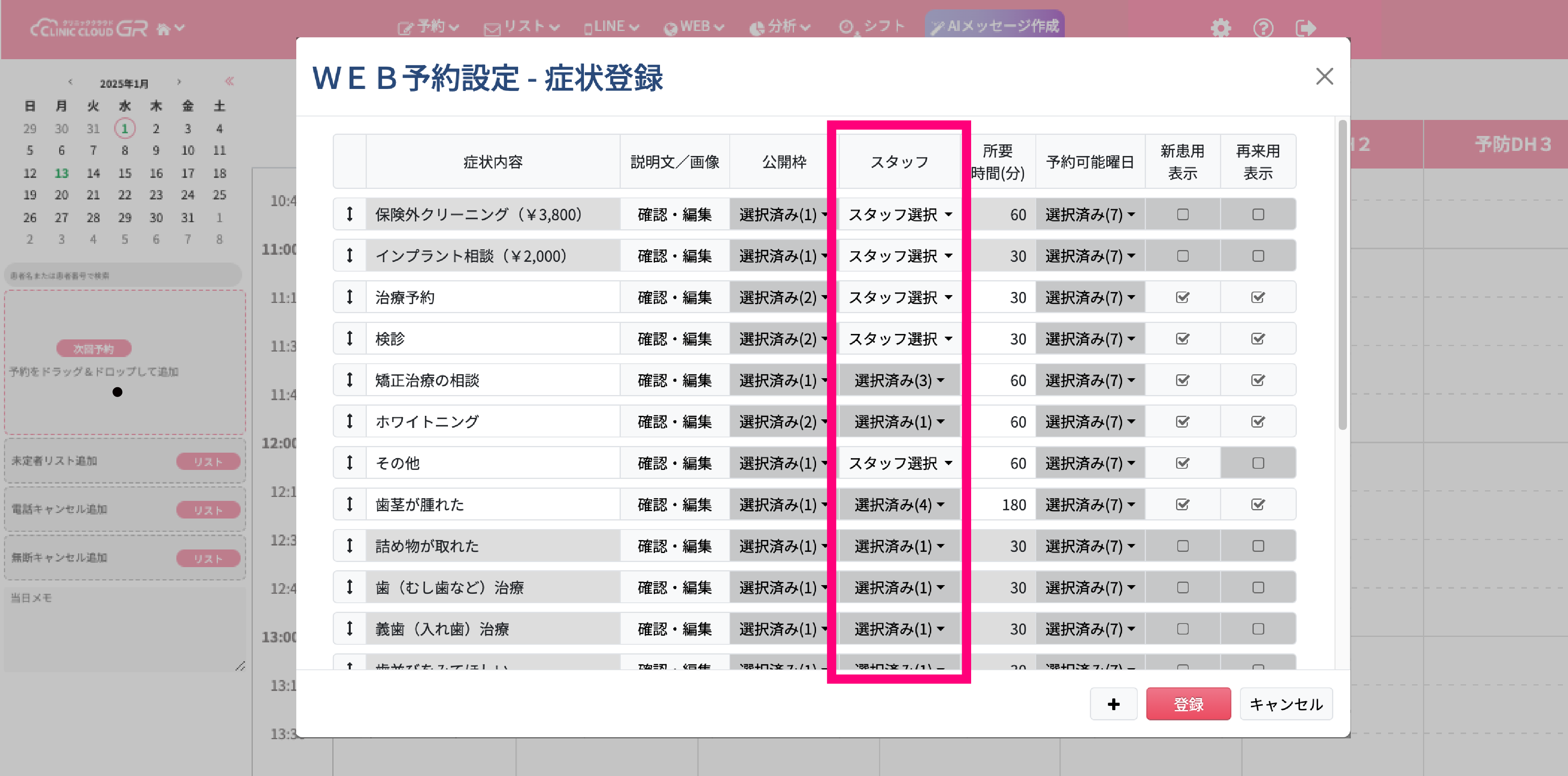 1.設定>WEB予約設定>症状登録 にスタッフの項目を追加、スタッフは複数選択できます※選択していない場合はスタッフ設定の上から順に割り当てられます