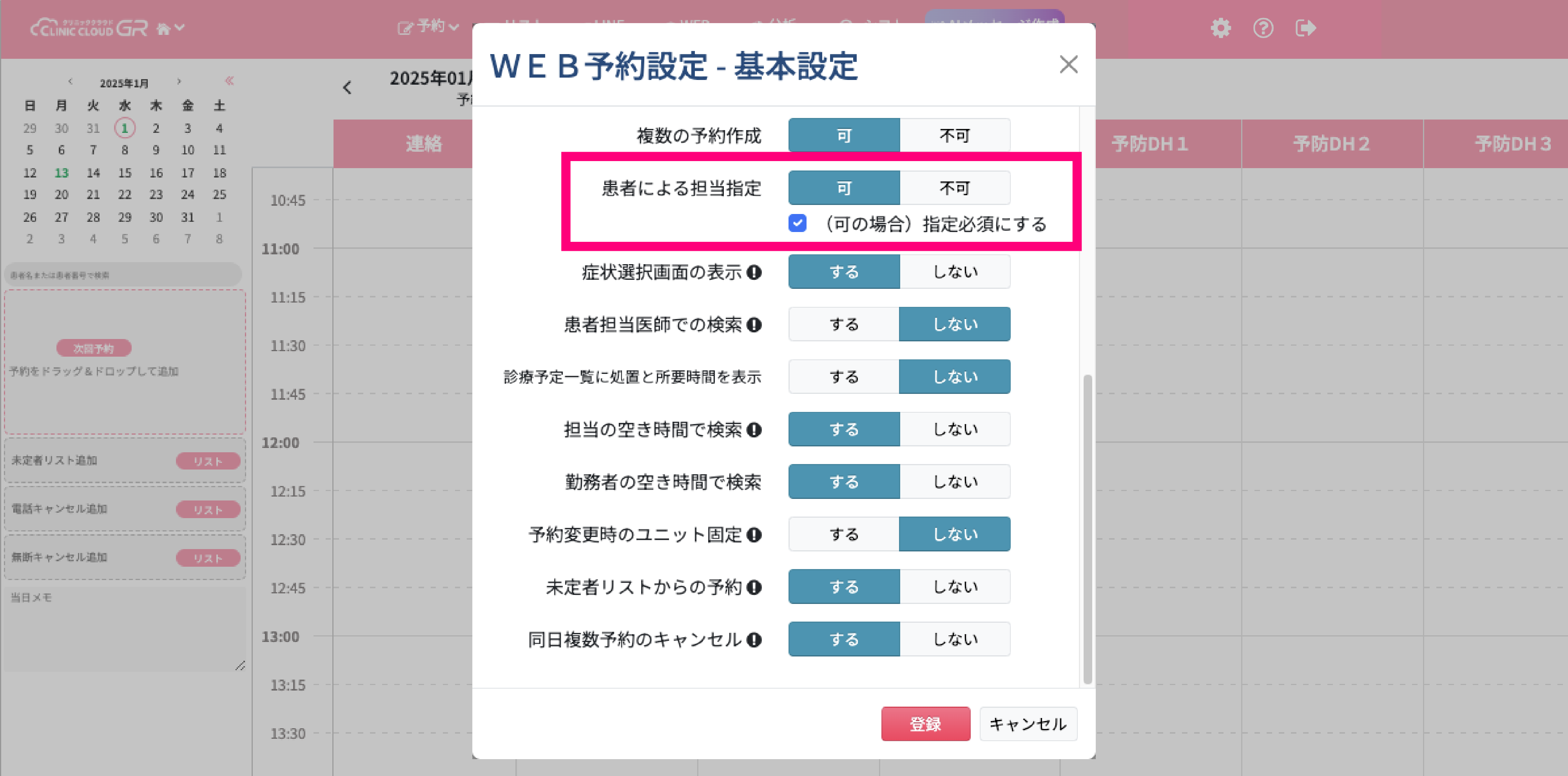 2.設定>WEB予約設定>基本設定>患者による担当指定>可 に設定している場合には症状に設定したスタッフのみが表示されます