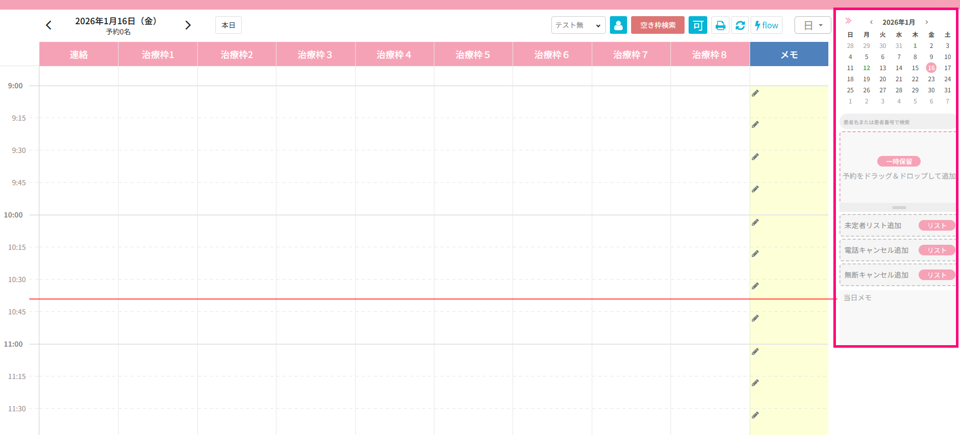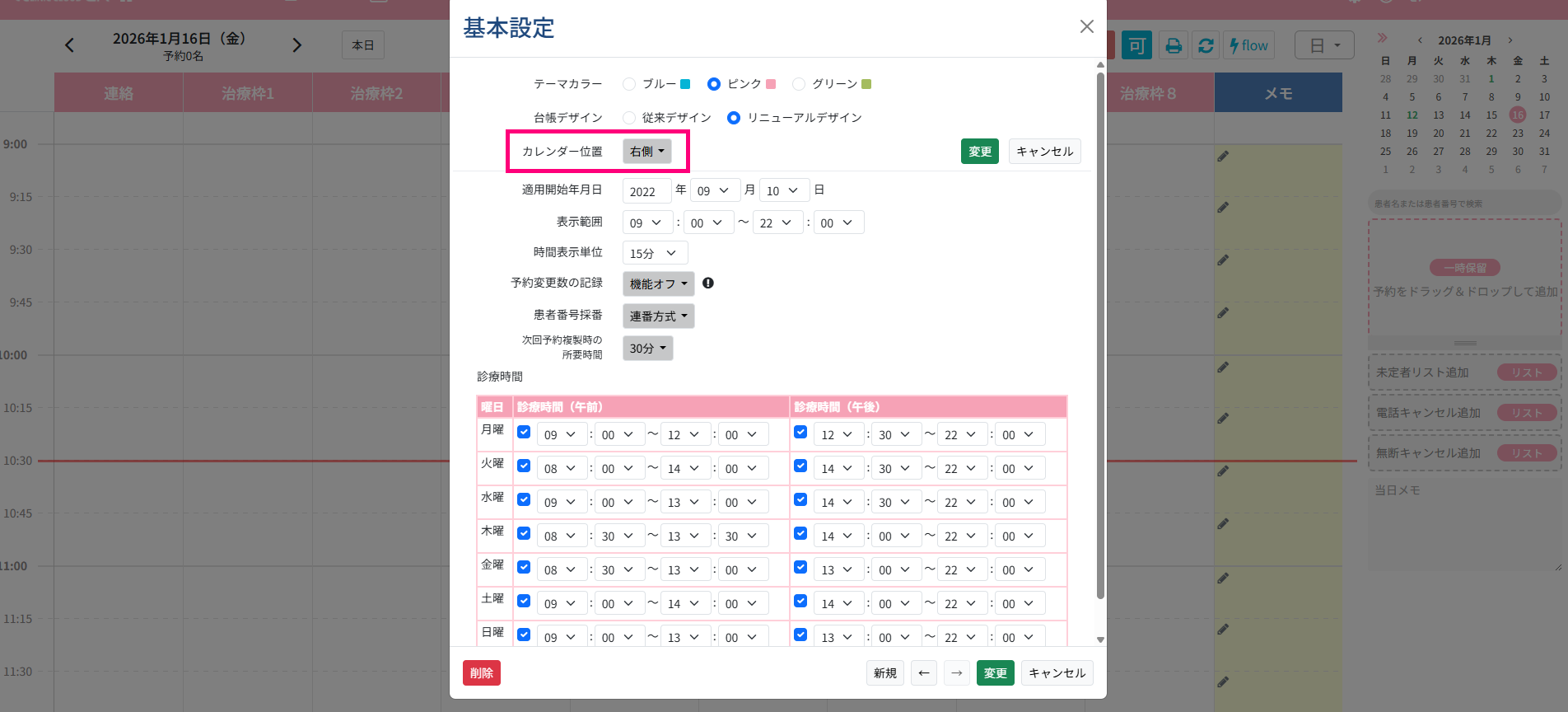 設定>基本設定>カレンダー位置「左側」「右側」を選択可能です。 カレンダーの切り替えに伴ってカレンダー下部のリスト等全てが左右に移動します。