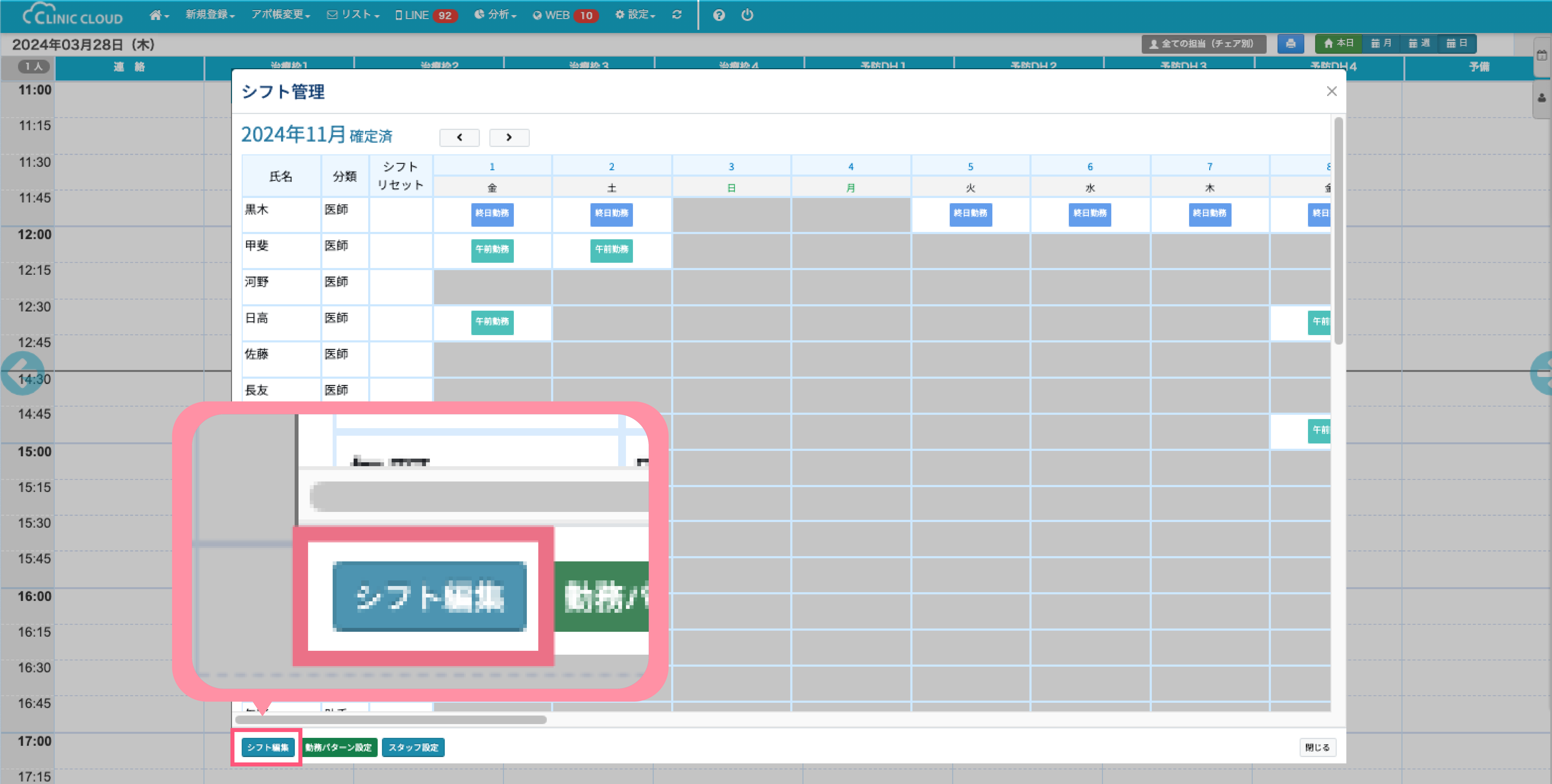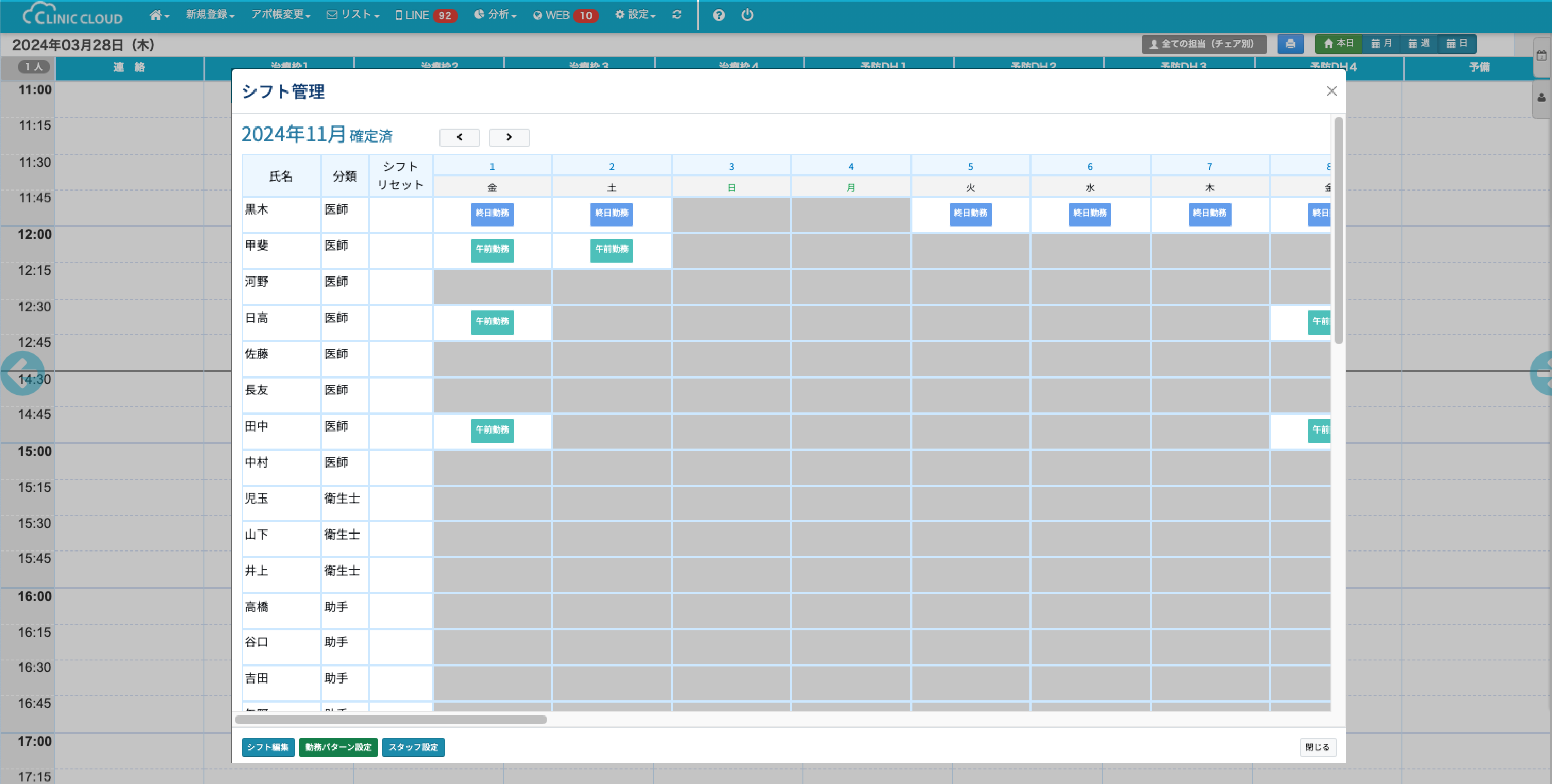 「シフト管理」機能アップデートのお知らせ 投稿日 2024年11月27日 ABOUT 「シフト管理」で過去のシフトが修正できるようになりました※編集できるのは2024年4月以降のシフトからになります 「設定」>「シフト管理」>「シフト編集」から修正できます ← 「予約詳細の履歴」機能アップデートのお知らせ → LINE「メッセージ送信」機能アップデートのお知らせ