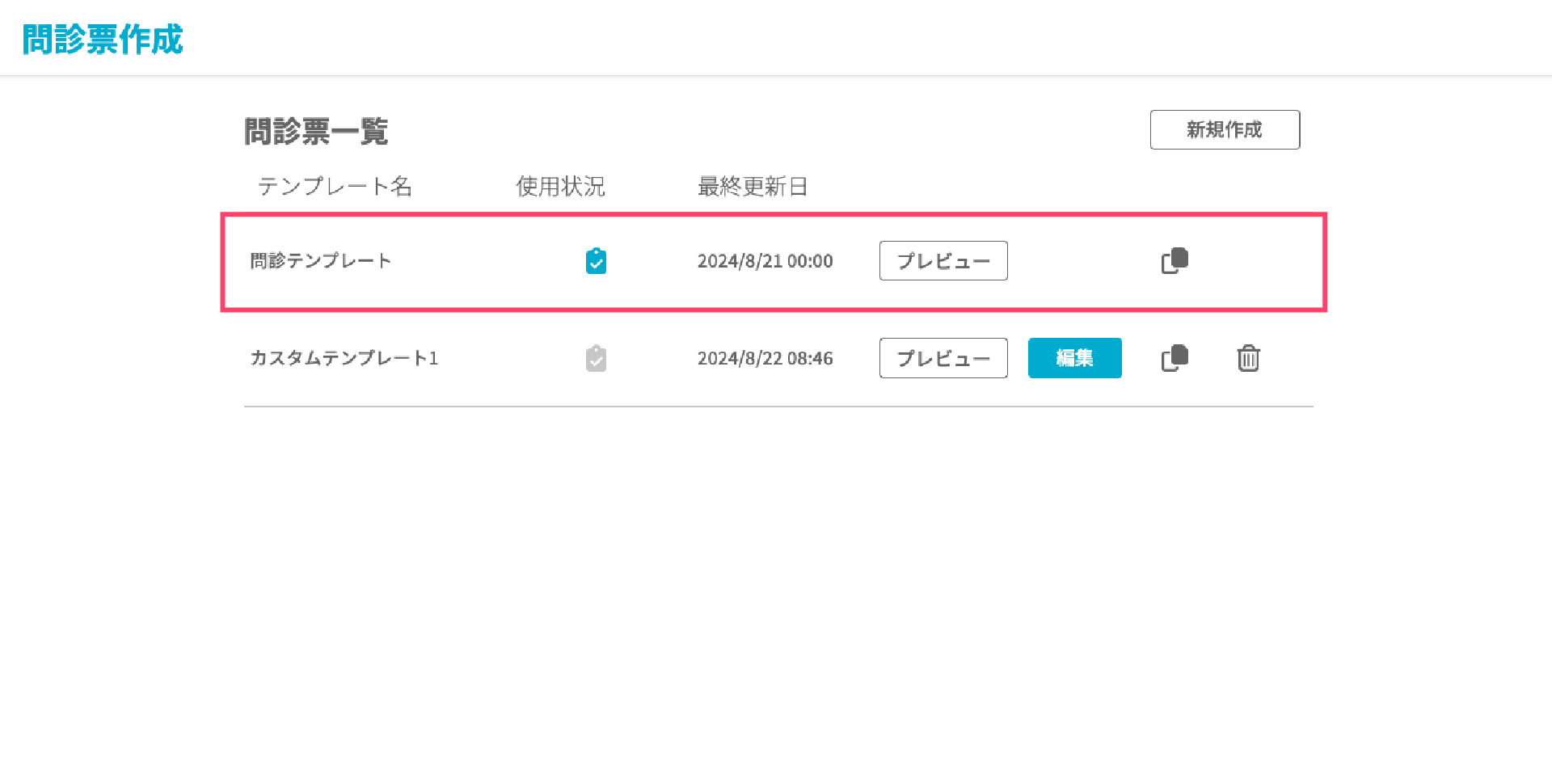 問診票のデフォルトテンプレートの追加とプレビュー画面の調整を行いました。