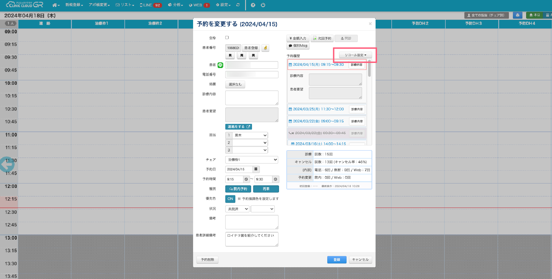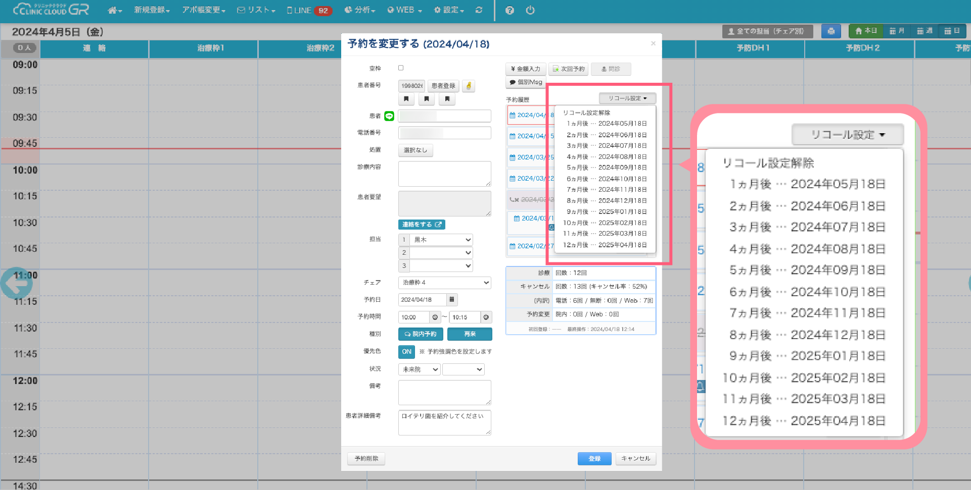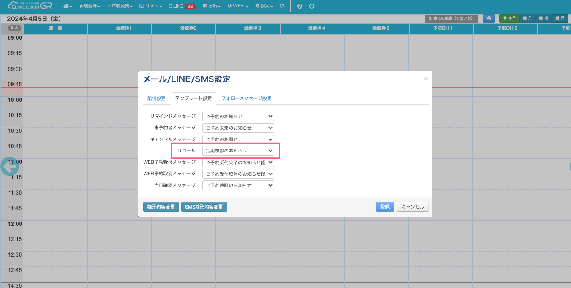 送信日時は予約日を基準に「リコール設定」から指定した日時にメッセージが送信されます