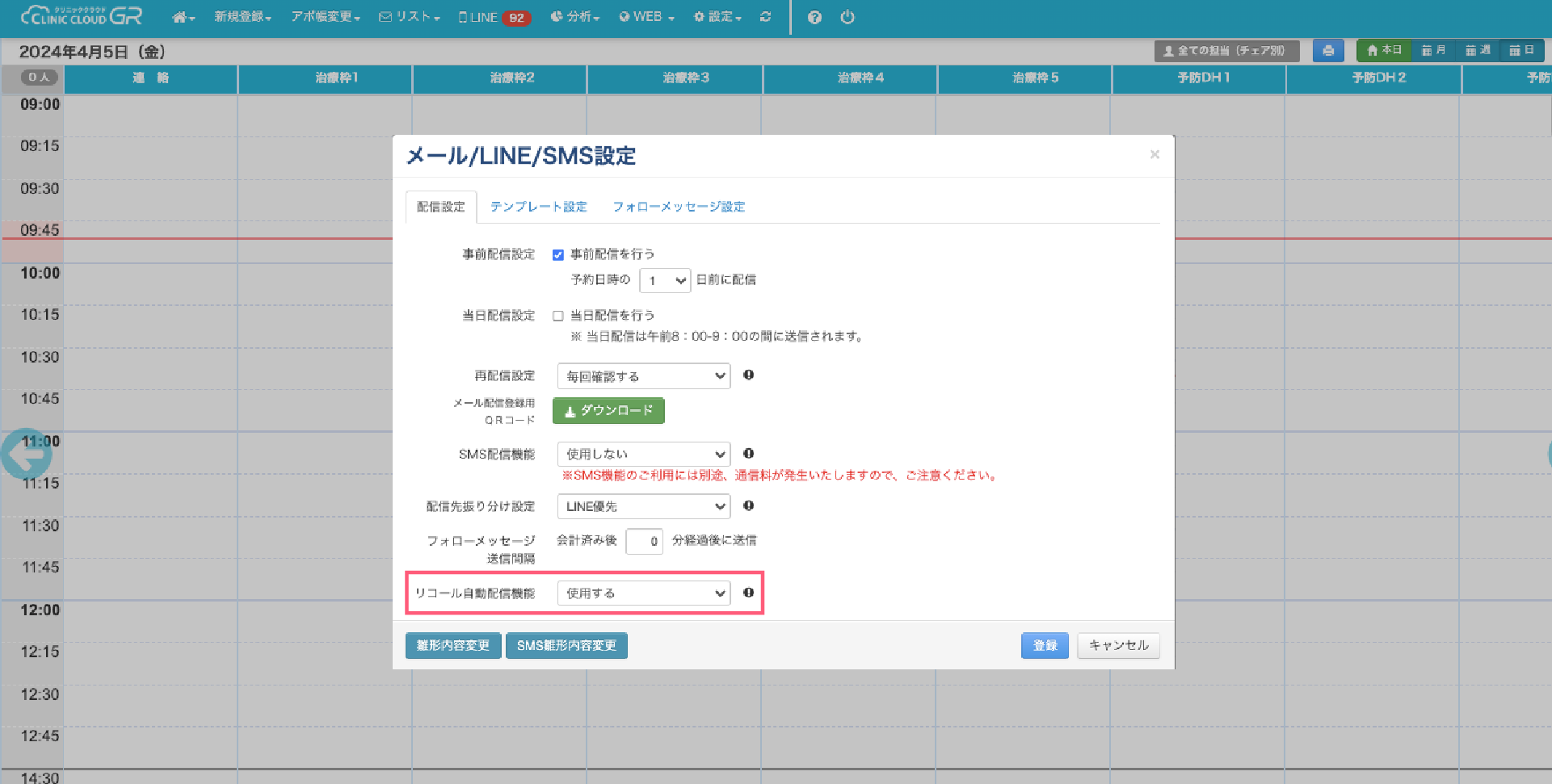 機能を利用する場合には「設定」>「メール/LINE/SMS設定」>「リコール自動配信機能」>「使用する」に変更してください