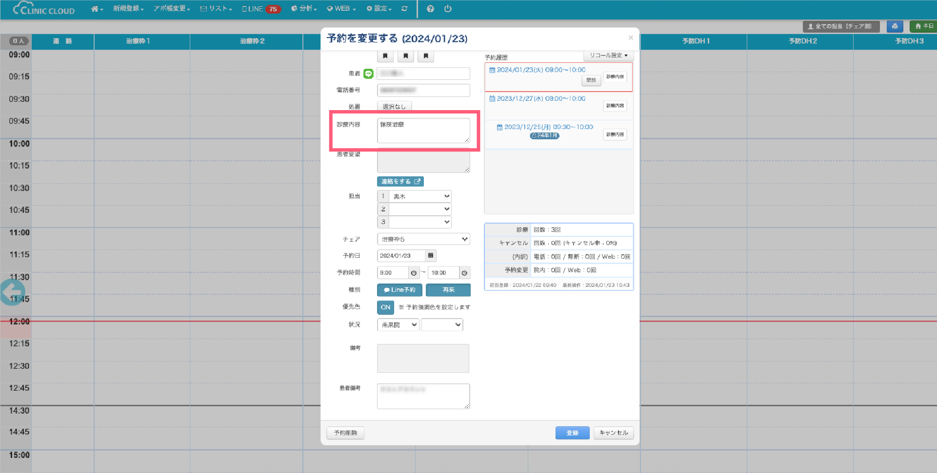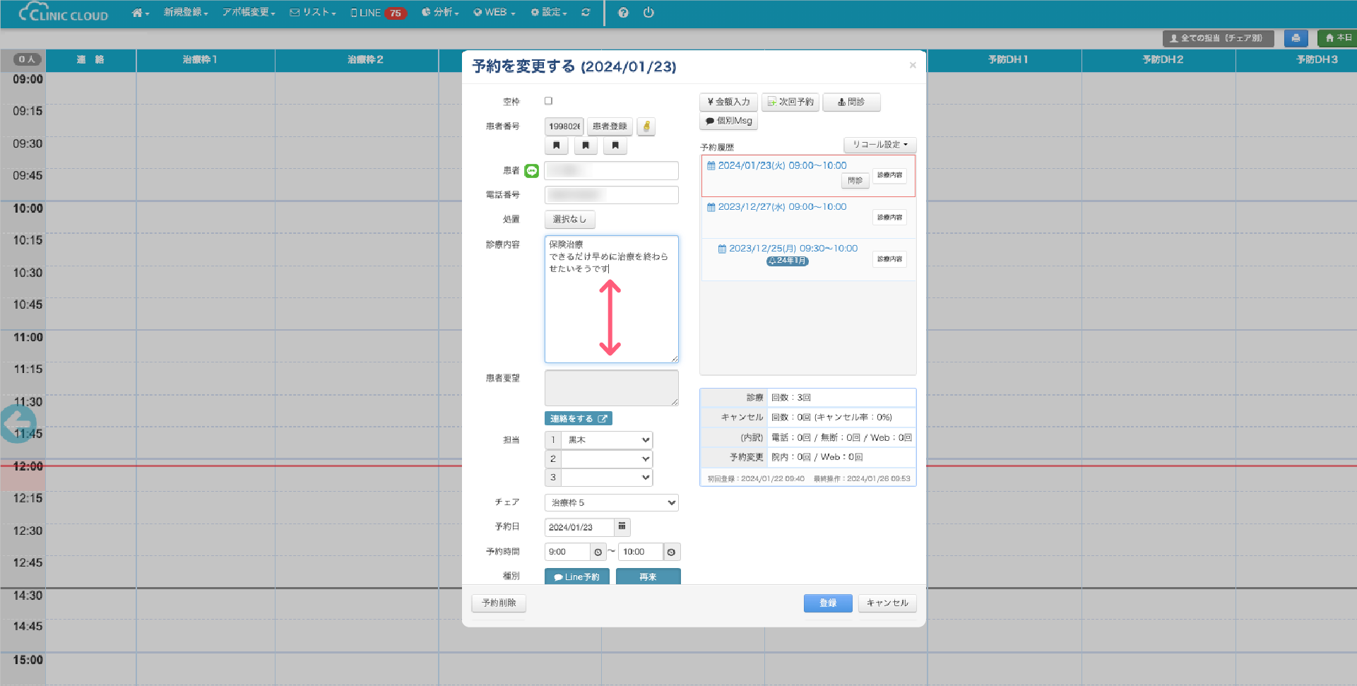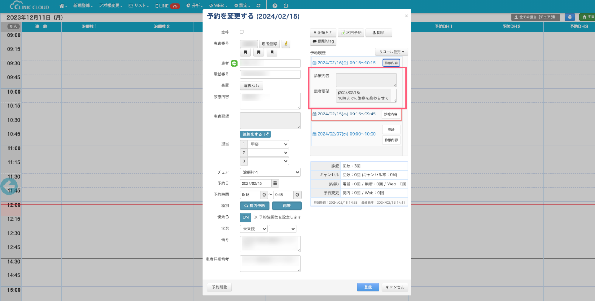「予約履歴」の「診療内容」をクリックすると「診療内容」と「患者要望」が確認ができるようになりました