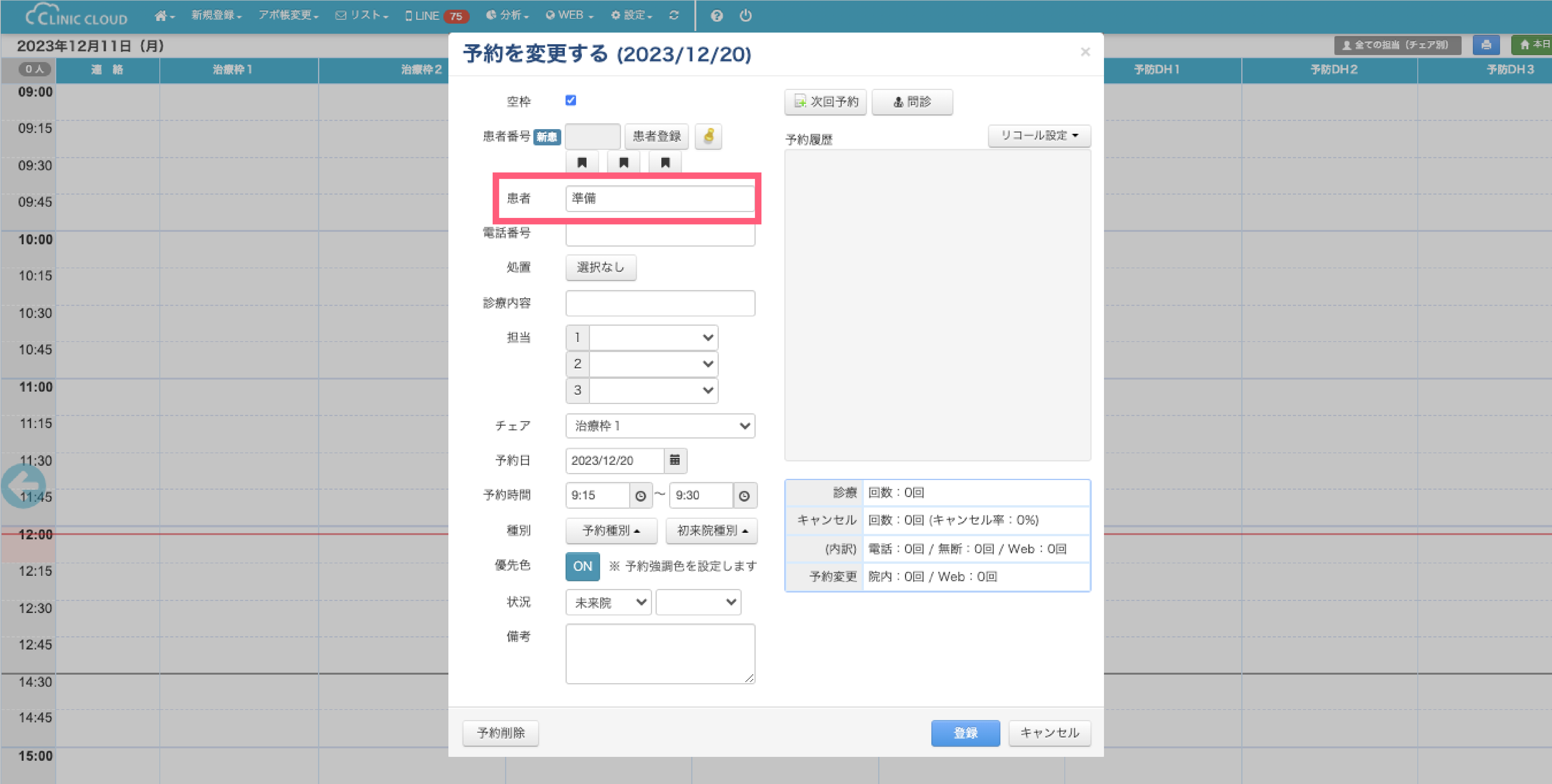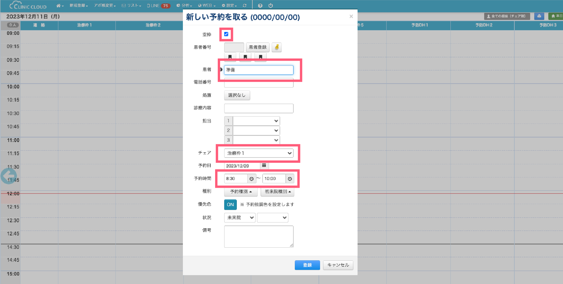 3.アポイント帳上の「空枠」に内容を表記したい場合には、予約枠を開いて「患者」の部分にミーティング、準備など任意の文言を入力し「登録」をクリックしてください