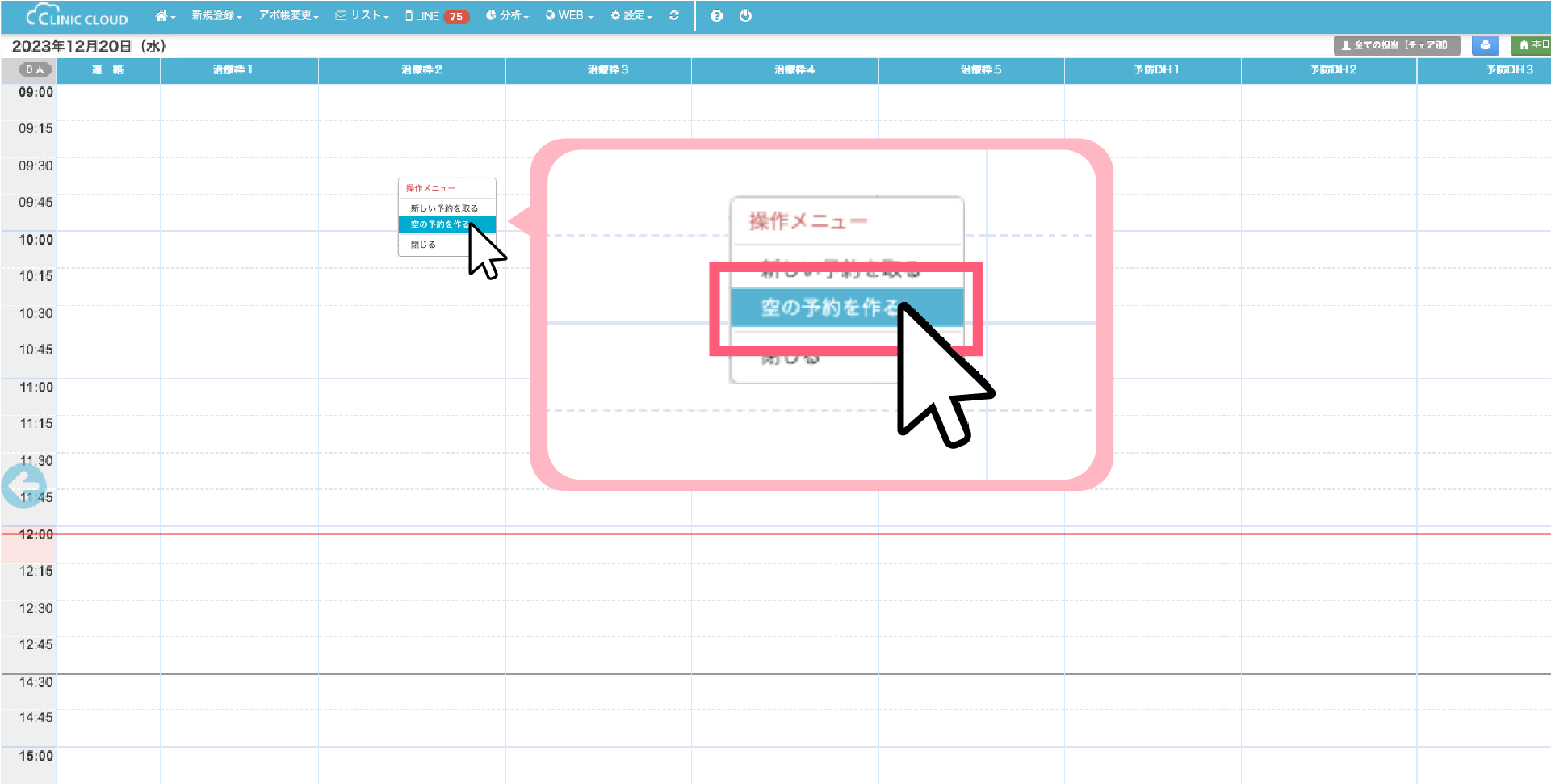 2.「操作メニュー」から「空の予約を作る」をクリックすると、アポイント帳上に空枠が生成されます