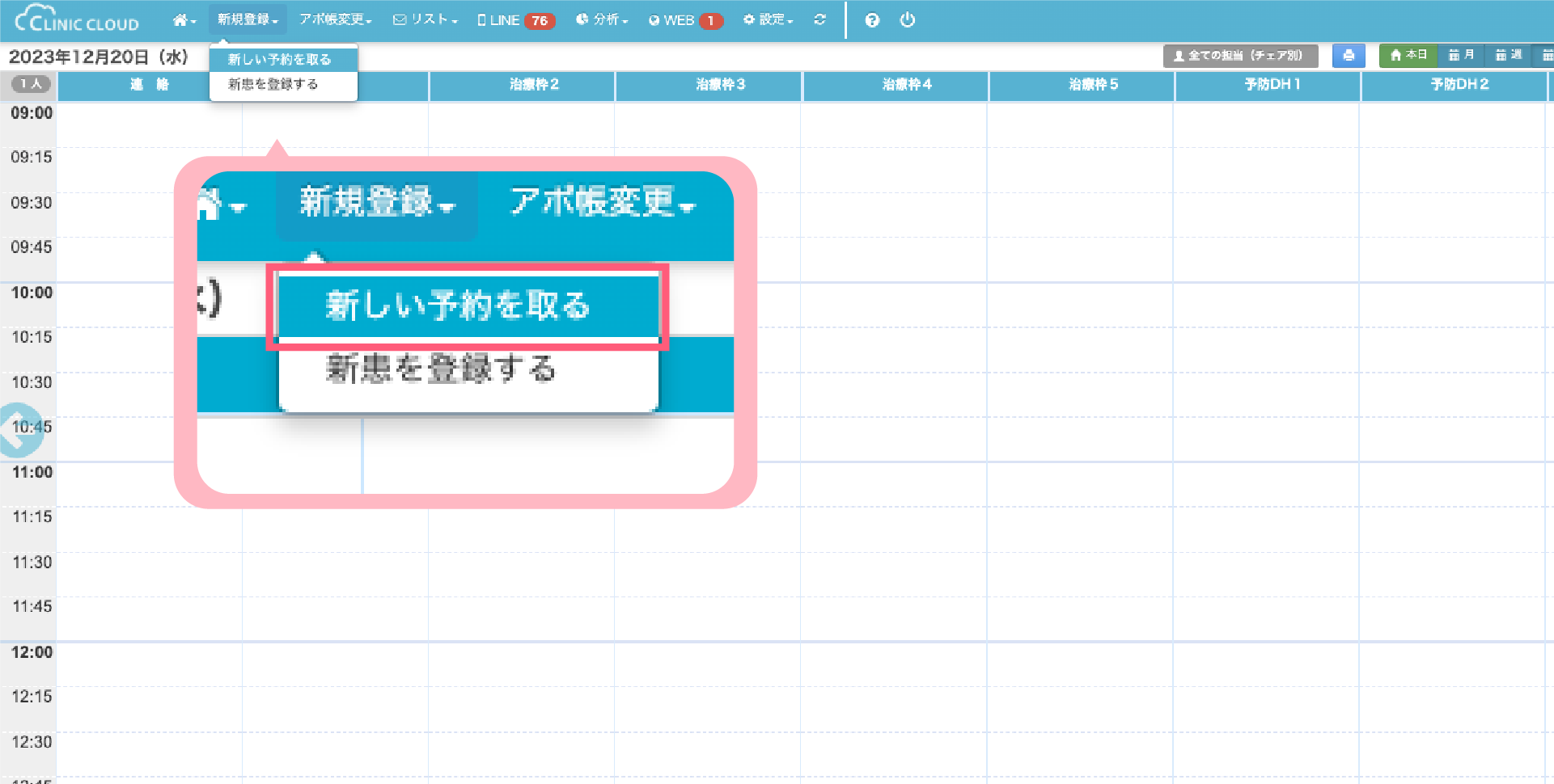 1.「新規登録」>「新しい予約を取る」をクリックします
