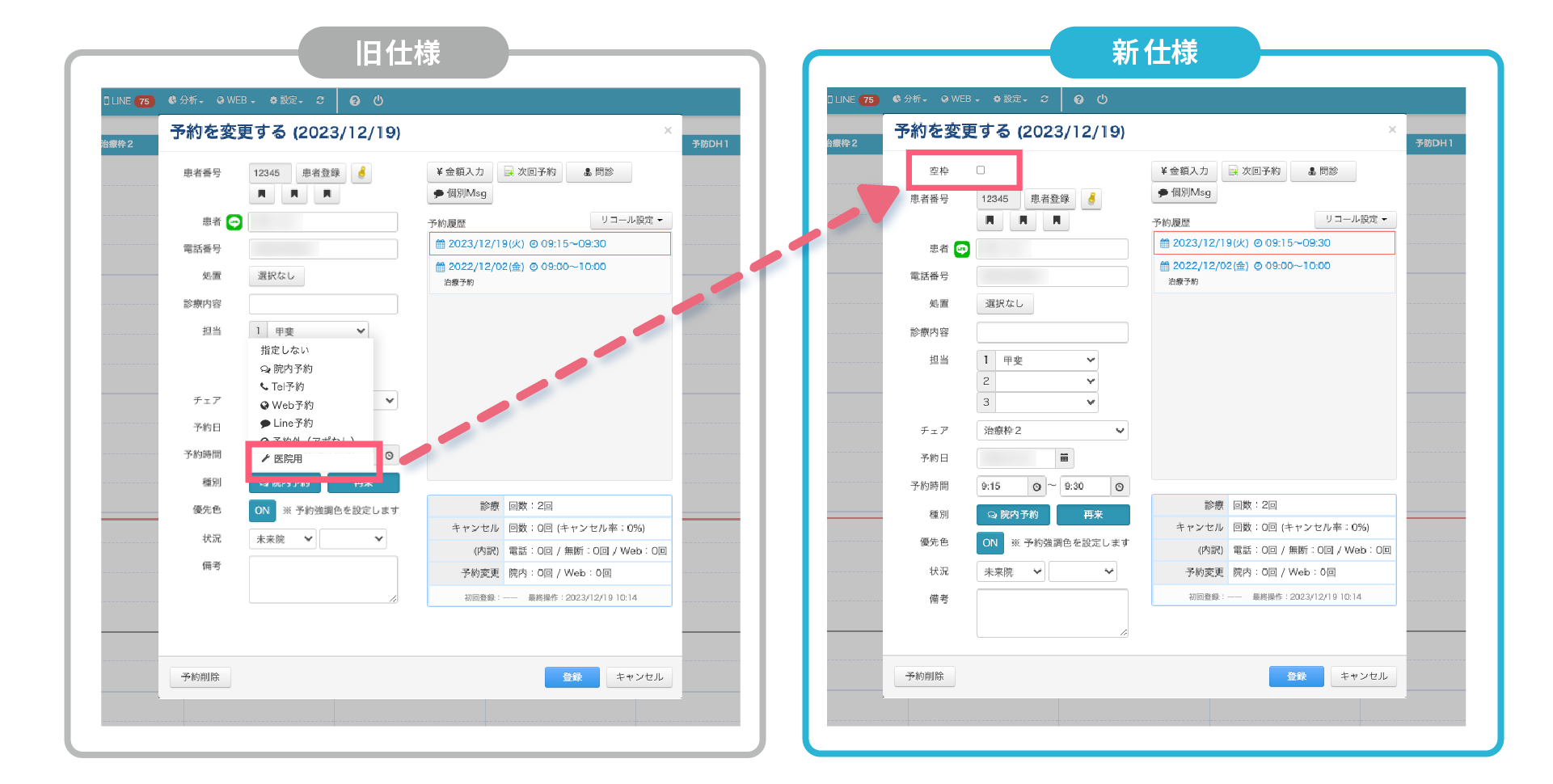 予約種別の「医院用」が「空枠」として機能が移動しました 。チェックを入れていただくことで、引き続き「空枠」は研修や準備などで予約を受けたくない場合などにご利用できます