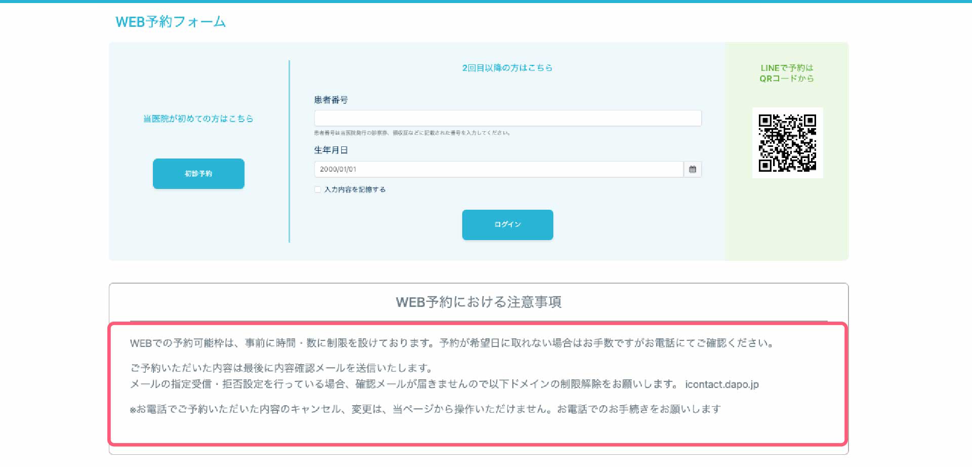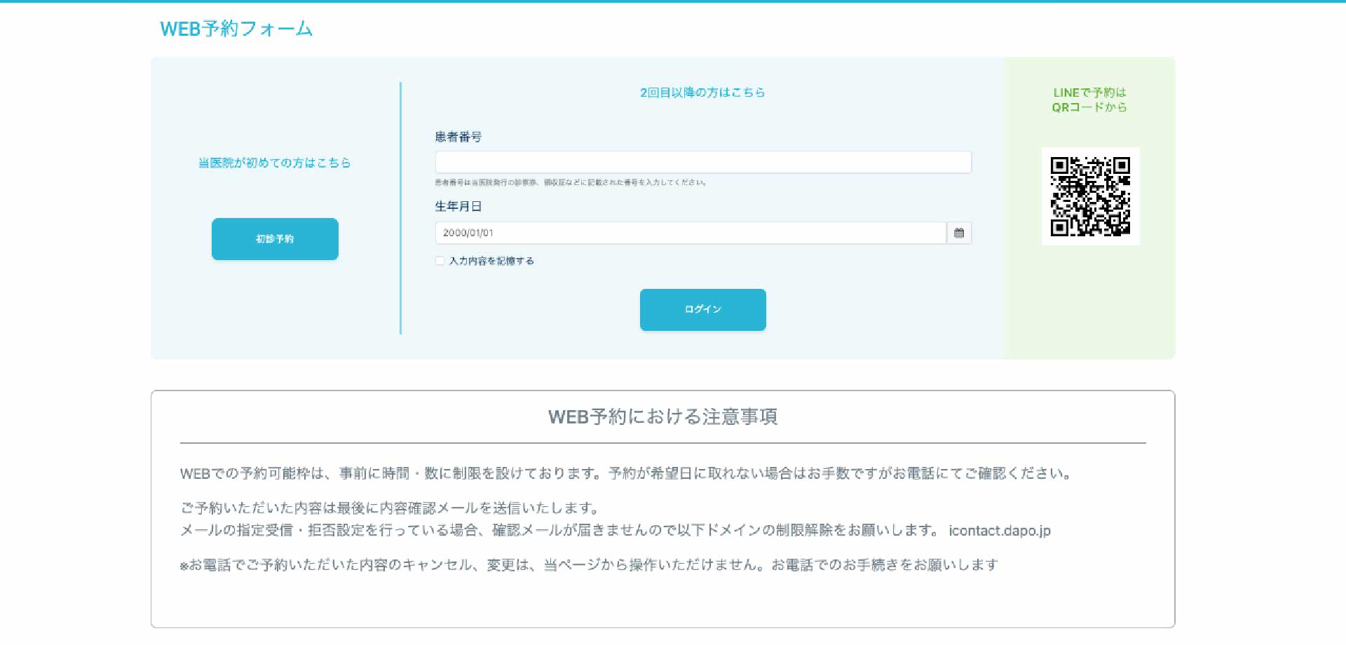 PCでWEB予約フォームを開く場合:左から「初診予約」「再来院予約」「LINEのQRコード※」が同じ画面に表示されます。