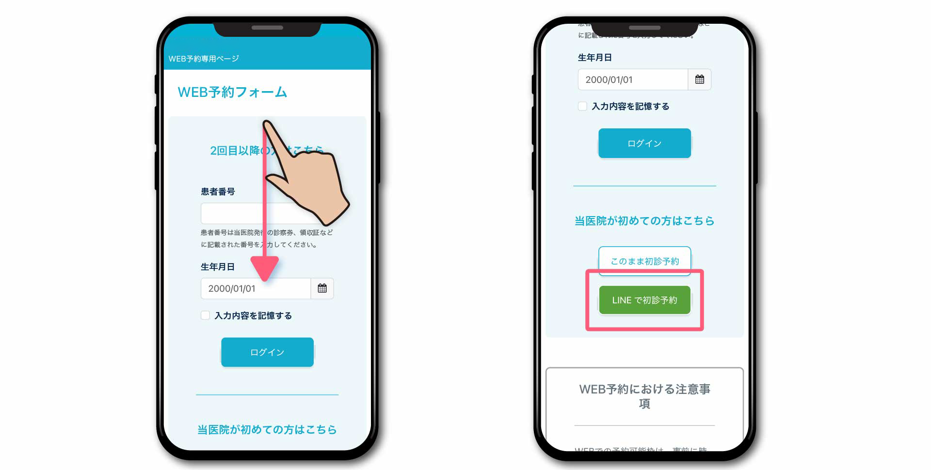 スマートフォンでWEB予約ページを開く場合:再来院の方のフォームの下にLINEボタンが表示され、タップするとLINEに遷移します。