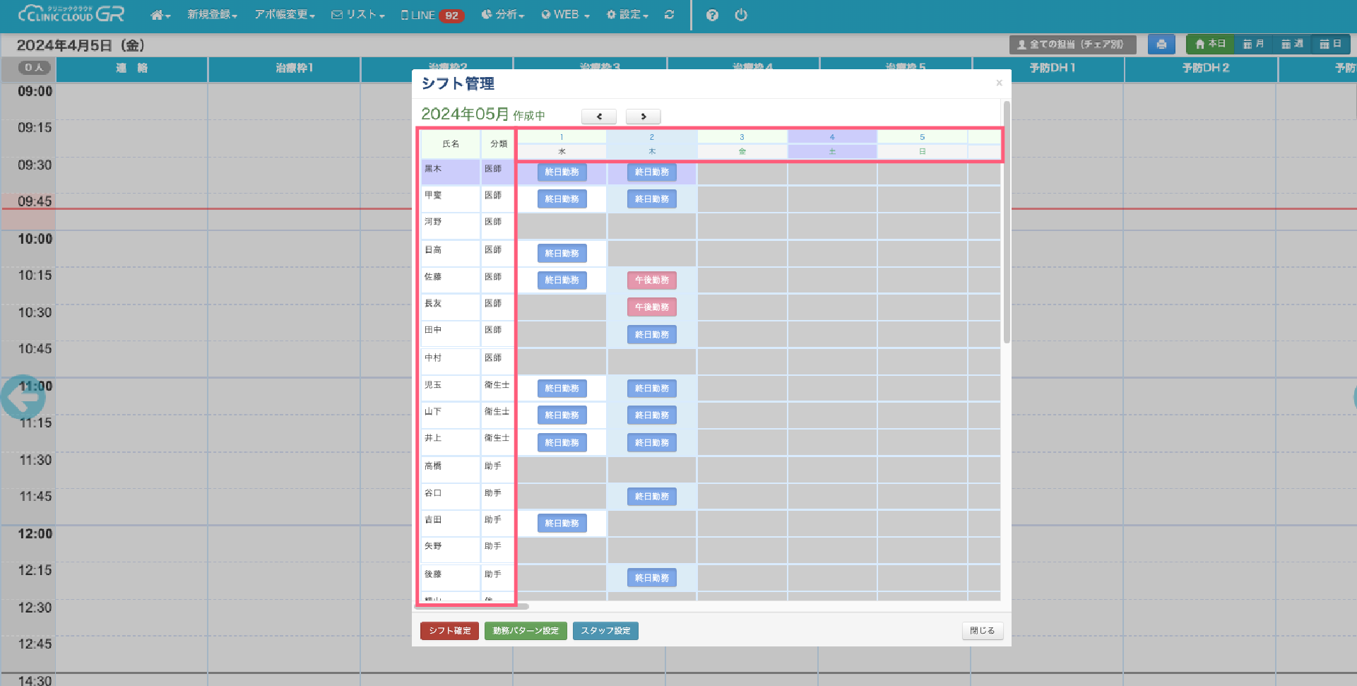「シフト管理」機能アップデートのお知らせ 投稿日 2024年5月9日 ABOUT 「シフト管理」の氏名・分類の列と日付・曜日の行が固定されるように機能アップデートいたしました ← 「シフト管理」機能追加のお知らせ → 「LINE通知リスト」機能アップデートのお知らせ